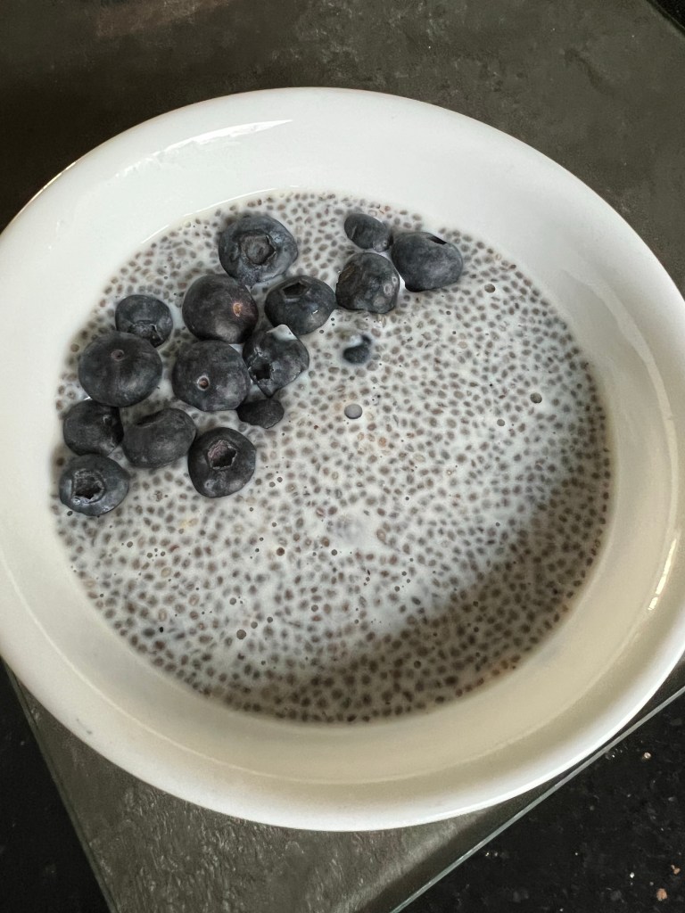 Chia pudding blowl is a dense and filling breakfast. Chia seeds is a super food. They are high in fibre, antioxidants,, protien and omega3 fatty acids.